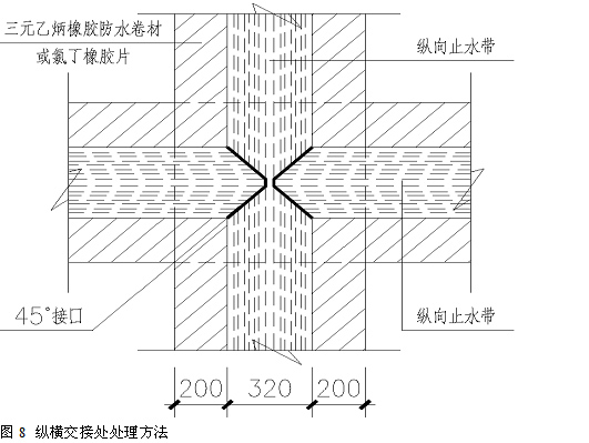 橡膠止水帶縱橫交接處,在混凝土墊層上沿縱橫止水帶外側(cè)向外擴(kuò)展各200mm,其間粘貼3mm厚的三元乙丙橡膠防水卷材或氯丁橡膠片(粘貼于墊層之上,要牢固)。然后將橫向止水帶兩邊沿45°角斷開(kāi),并與縱向止水帶拼接嚴(yán)密。再用401 防水膠將止水帶與防水卷材或橡膠片粘貼牢固,并在接口處刷氯丁膠粘劑,將接口包實(shí)。如圖8 所示。