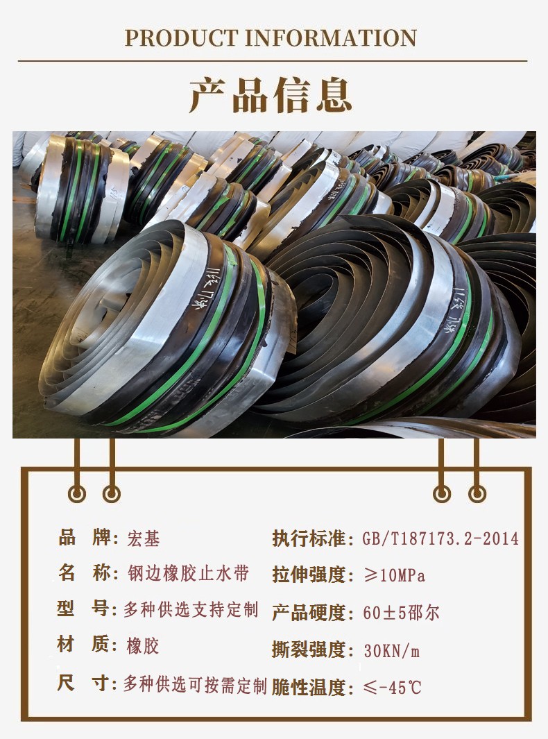 鋼邊橡膠止水帶應用范圍:鋼邊橡膠止水帶主要用于混凝土現(xiàn)澆時設在施工縫及變形縫內(nèi)與混凝土結構成為一體的基礎工程,如地下設施、隧道涵洞、輸水渡槽、攔水壩、貯液構筑物等